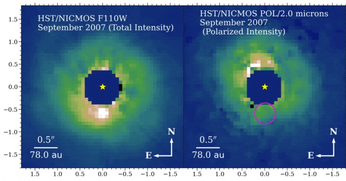 The combination of Subaru data (red image) and Hubble data (blue image) reveals the presence of an exoplanet at a distance of 93 Astronomical Units (where 1 A.U. is the Earth-Sun distance) from its parent star. The luminosity of the massive object indicates reflected stellar emission rather than unimpeded direct emission, while the lack of a polarization signal is highly suggestive of a formation scenario other than core accretion. This is one of more than 5000 exoplanets presently known.