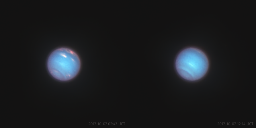 These images of Neptune, from October 7, 2017 with the Hubble Space Telescope, shows the presence of clouds, bands, and varying colors and temperatures across Neptune’s upper atmosphere. Neptune completed its first complete revolution since its discovery in 2011, and now journeys on its second.(Credit: ESA/Hubble and NASA, Acknowledgement: Judy Schmidt.)