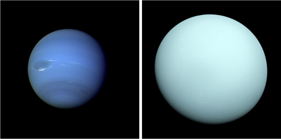 Uranus, shown at right, appeared to orbit in violation of the laws of planetary motion. Rather than suggest a modification to the laws of gravity, simply adding in an undiscovered mass with the right parameters beyond Uranus (like Neptune, at left) could explain the observed anomalies in its orbit. (Credit: NASA/Voyager 2)