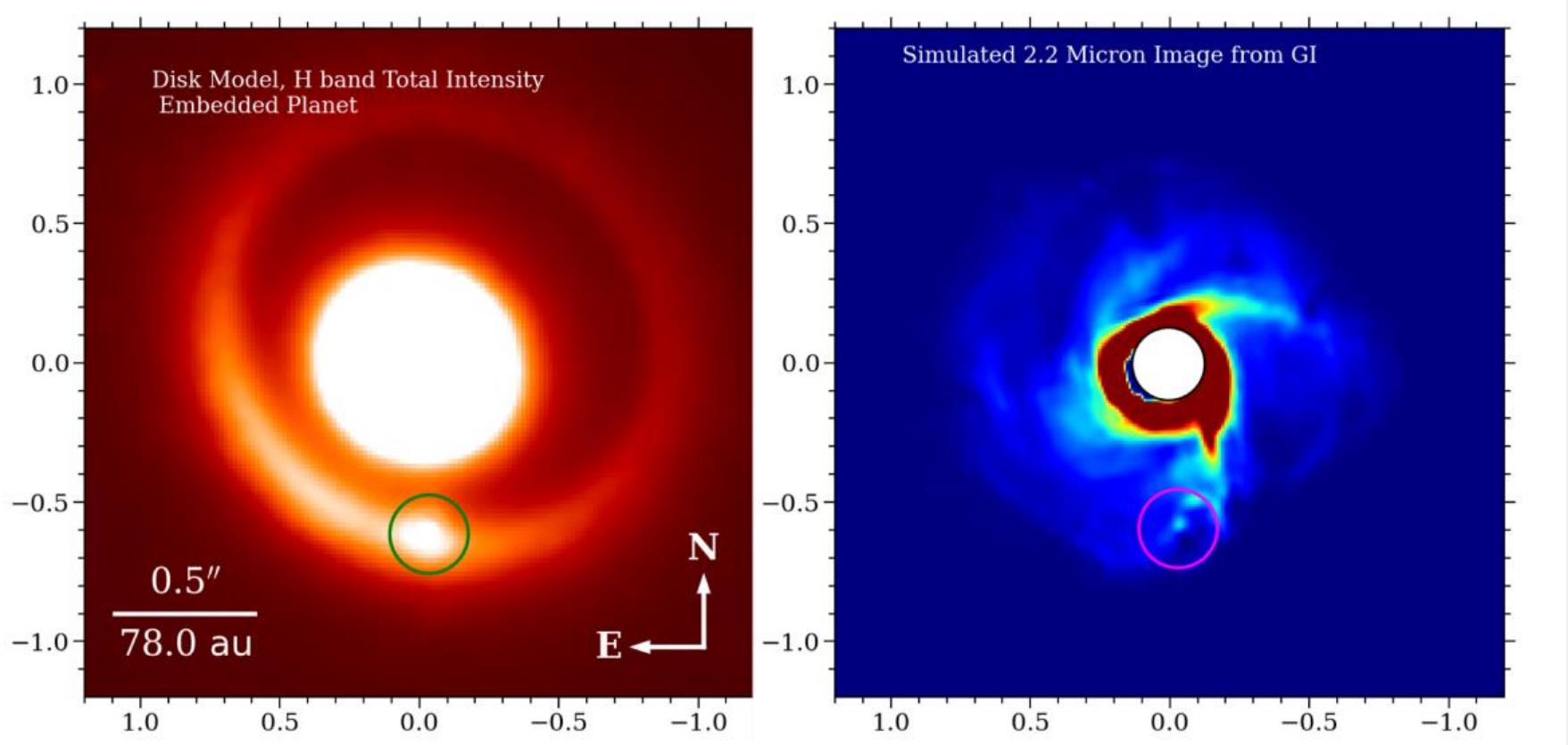 These two synthetic images are derived from simulations of the AB Aurigae system, including a protoplanetary disk and an embedded super-Jupiter planet. This planet represents the densest, hottest clump in a gravitational instability scenario.