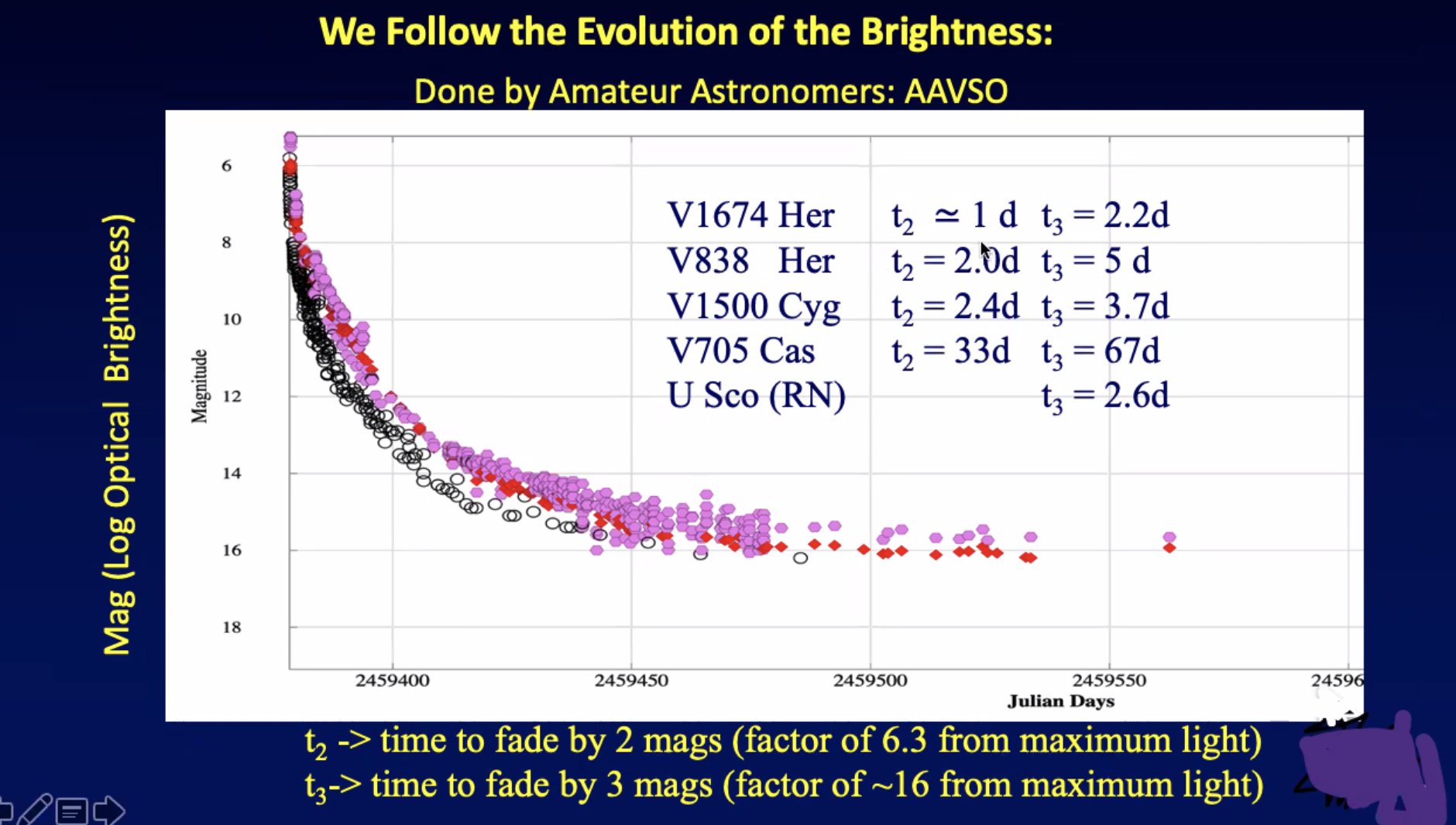 This model leads to one more spectacular prediction that’s never yet been confirmed: as white dwarfs get closer and closer to that ultimate mass limit, and to an eventual type Ia supernova, we expect the time between subsequent recurrent novae will get shorter, and the decline from peak brightness of each nova will get faster and faster. This gives us the triple expectations that: