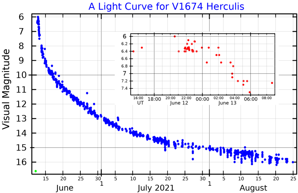 In fact, we’ve just observed the fastest nova ever recorded: V1674 Hercules, which occurred between a white dwarf and a very tightly-orbiting star located 15,000 light-years away from us. The light from the nova declined extraordinarily quickly: falling by +2 astronomical magnitudes (about a factor of 6) after just 2 days, and falling by a total of +3 astronomical magnitudes (a factor of ~16) in only 3 days. Its binary companion completes an orbit in just 3.67 days: 24 times faster than Mercury orbits the Sun.