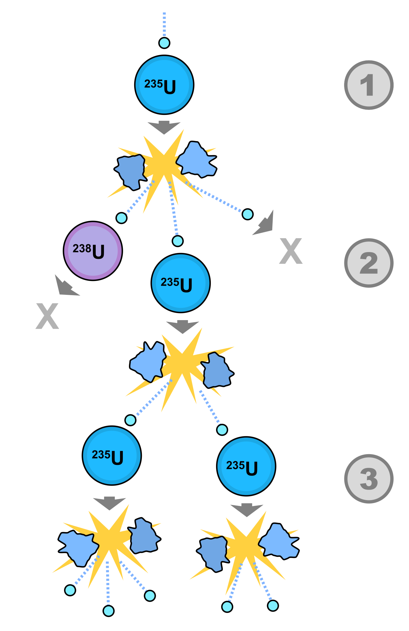 This diagram shows the chain reaction that can ensue when an enriched sample of U-235 is bombarded with a free neutron. Once U-236 is formed, it quickly splits apart, releasing energy and producing three additional free neutrons. If this reaction runs away, we get a bomb; if this reaction can be controlled, we can build a nuclear reactor. (Credit: Fastfission/Wikimedia Commons)