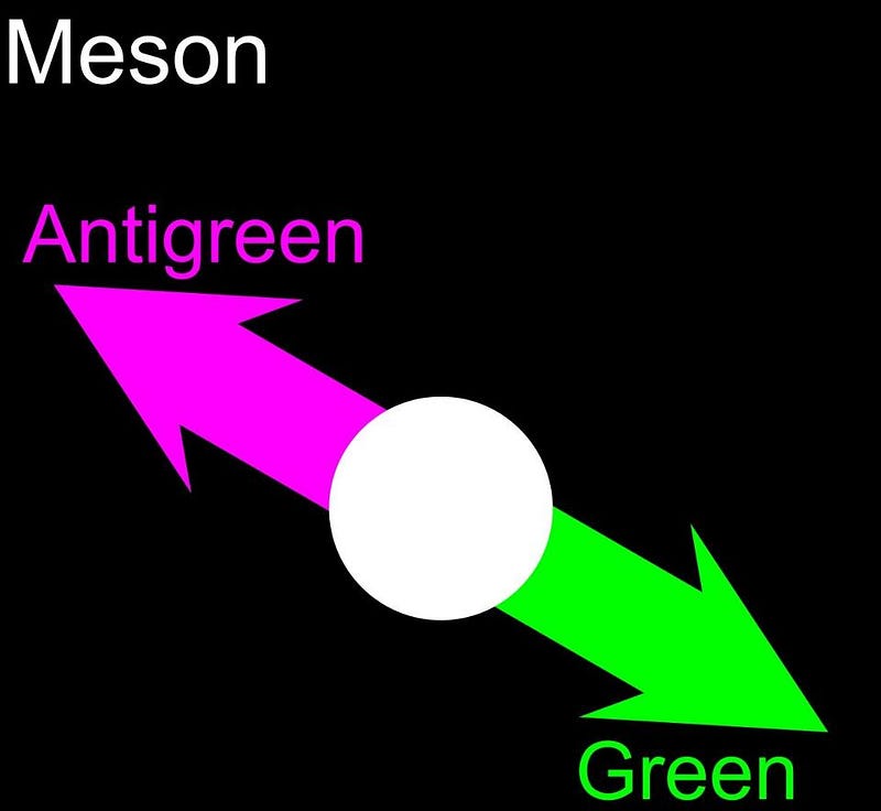 But here’s the kicker: so long as you make a combination that’s color-neutral, it ought to be able to stably exist — at least, temporarily — in this Universe. You can make something color neutral either with a combination of a color charge and its anti-color charge (like a quark-antiquark pair), or a combination of three colors (or three anti-colors), like a proton, which is made up of three quarks. We call this color-neutral combination “white,” and so long as something’s white, it can exist if the other conditions are right in nature. In all cases, these quarks (or antiquarks) change their individual colors over time by the emission and absorption of (colored) gluons, but the total combination always remains color-neutral.