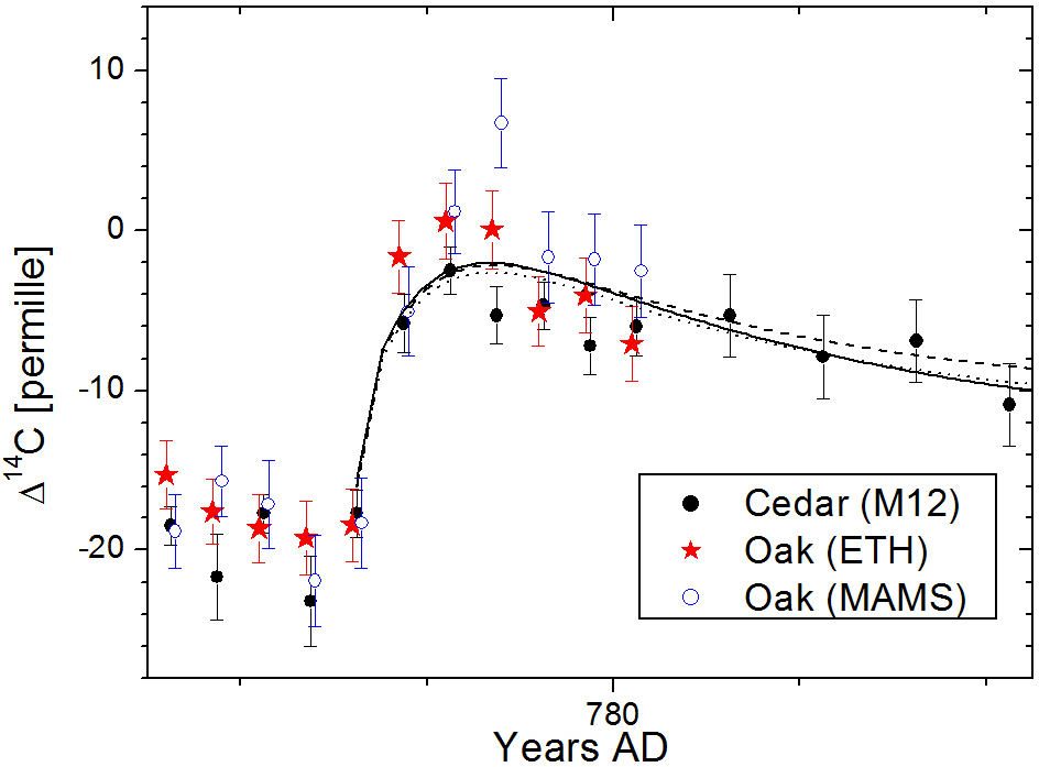 The fact that carbon-14 levels rose is interesting, but isn’t compelling enough, on its own, to reveal a solar storm as the underlying cause. Sure, solar activity is one possibility, but cosmic flares, gamma-ray bursts, or even receiving a direct hit from a black hole jet or collimated supernova event could also cause a spike in carbon-14. However, we have other historical and scientific evidence, and when you add them all together, a solar event is the only reasonable conclusion.
