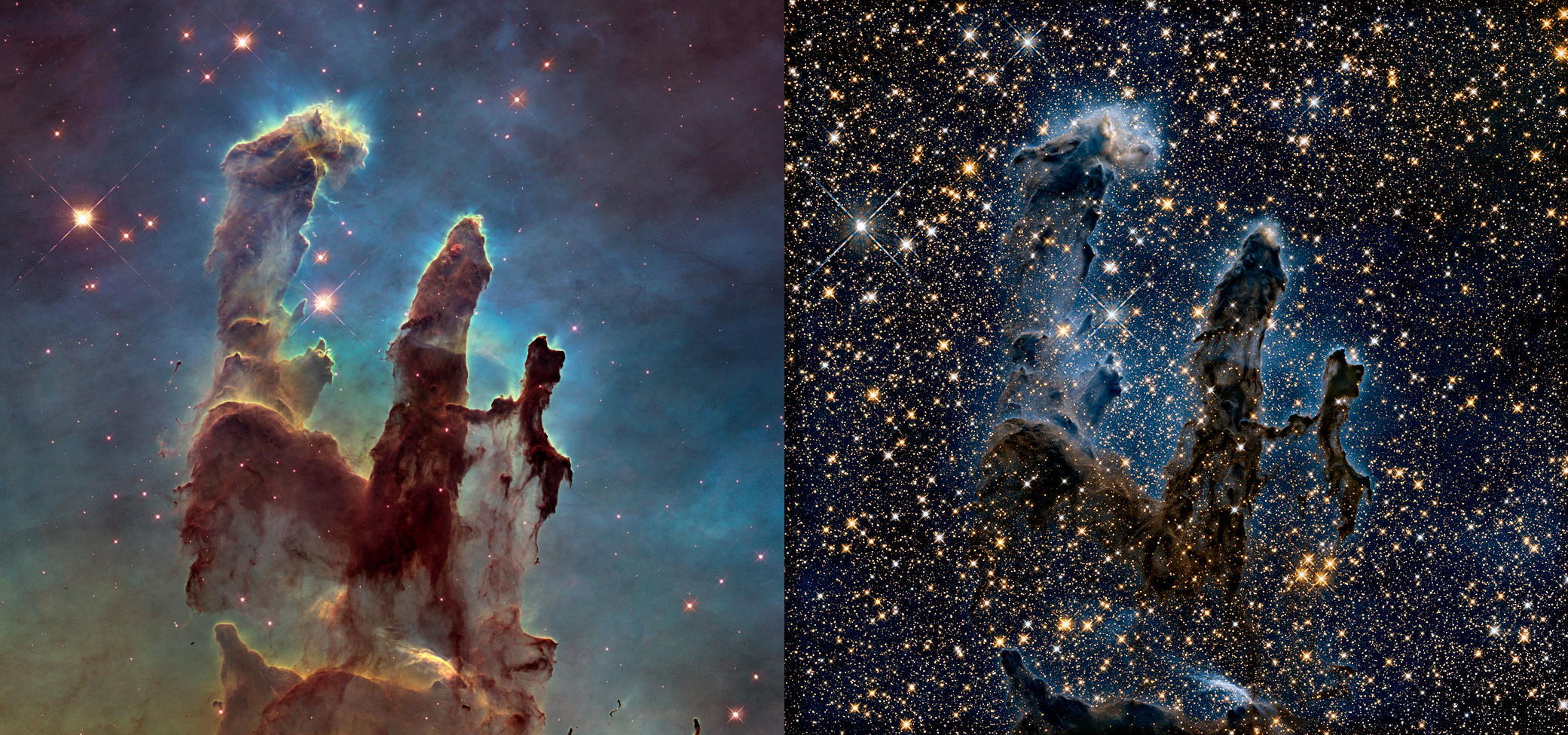 The same object, the Pillars of Creation in the Eagle Nebula, can have vastly different details revealed dependent on the wavelength of light used. Here, the visible light (L) and near-infrared (R) views are shown, both taken with the Hubble Space Telescope and both taken with multiple, independent filters. (Credit: NASA, ESA/Hubble and the Hubble Heritage Team)