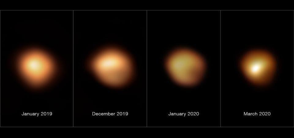 These four images show Betelgeuse in the infrared, all taken with the SPHERE instrument at the ESO’s Very Large Telescope. Based on the faintening observed in detail, we can reconstruct that a “burp” of dust caused the dimming. Although variability remains larger than it was previously, Betelgeuse has returned to its original, early-2019-and-before brightness. (Credit: ESO/M. Montargès et al.)