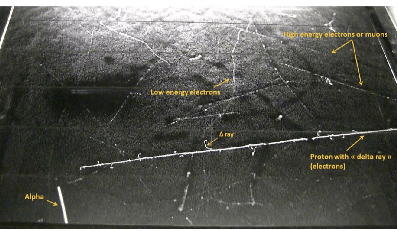 If you build a cloud chamber in precisely this fashion, however, those α-particle tracks aren’t the only things you’ll see. In fact, even if you leave the chamber completely evacuated (i.e., you don’t put a particle-emitting source of any type inside or nearby), you’ll still see tracks: they’ll be mostly vertical and appear as perfectly straight lines.