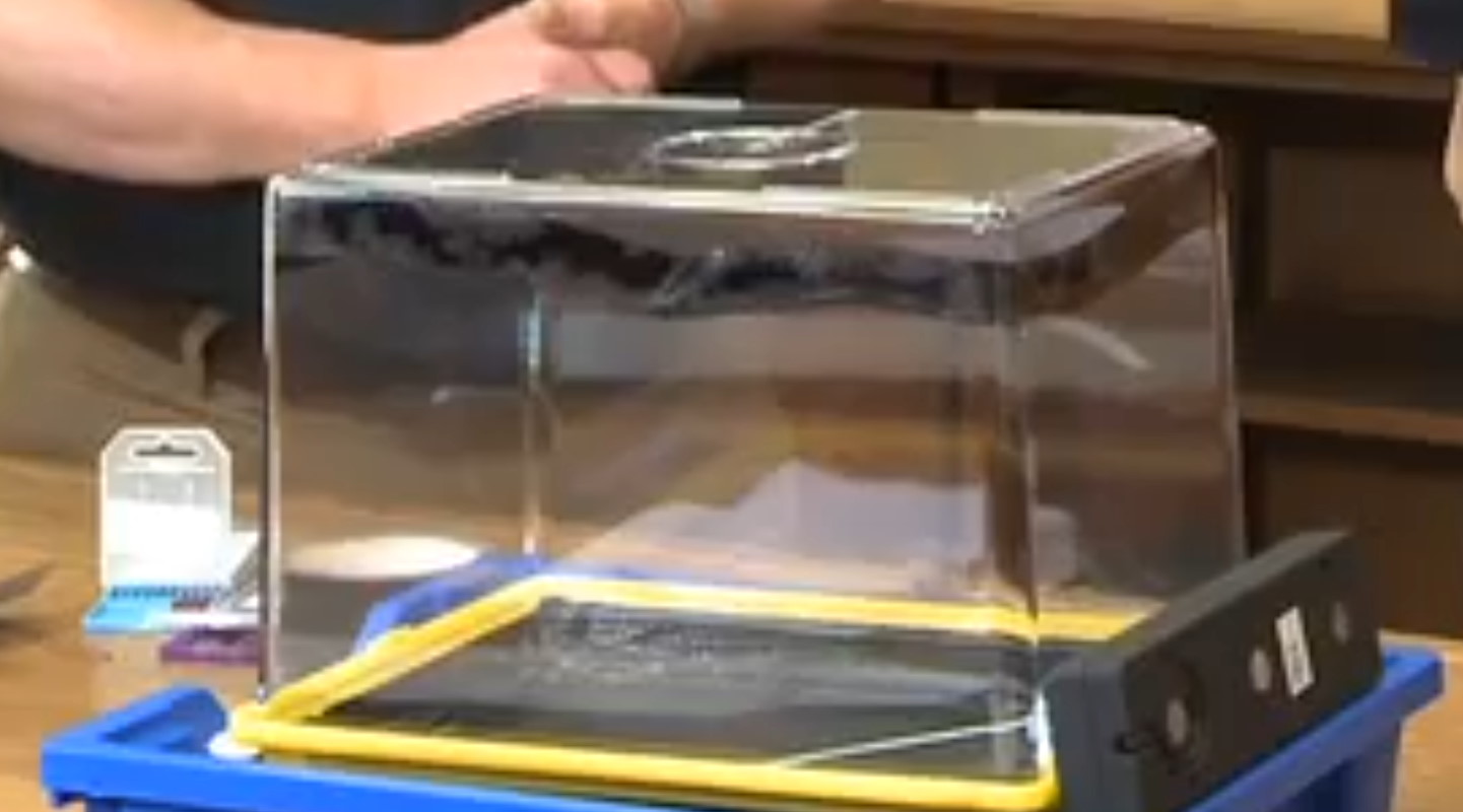 - Place some dry ice in the first two layers (solid base and hollow rectangle) of the insulating foam, then put the metal plate (black side up) atop that, then the last layer of insulating foam. Then put the water/alcohol into the clay groove, while simultaneously soaking/saturating the felt/sponge layer in the fishtank with the alcohol solution. (Pro tip: use more alcohol for saturating the felt/sponge layer than you think you ought to; don’t be stingy here!) Flip the fishtank over and put the edges inside the metal grooves, so that you have an airtight seal all around with the alcohol vapor inside.