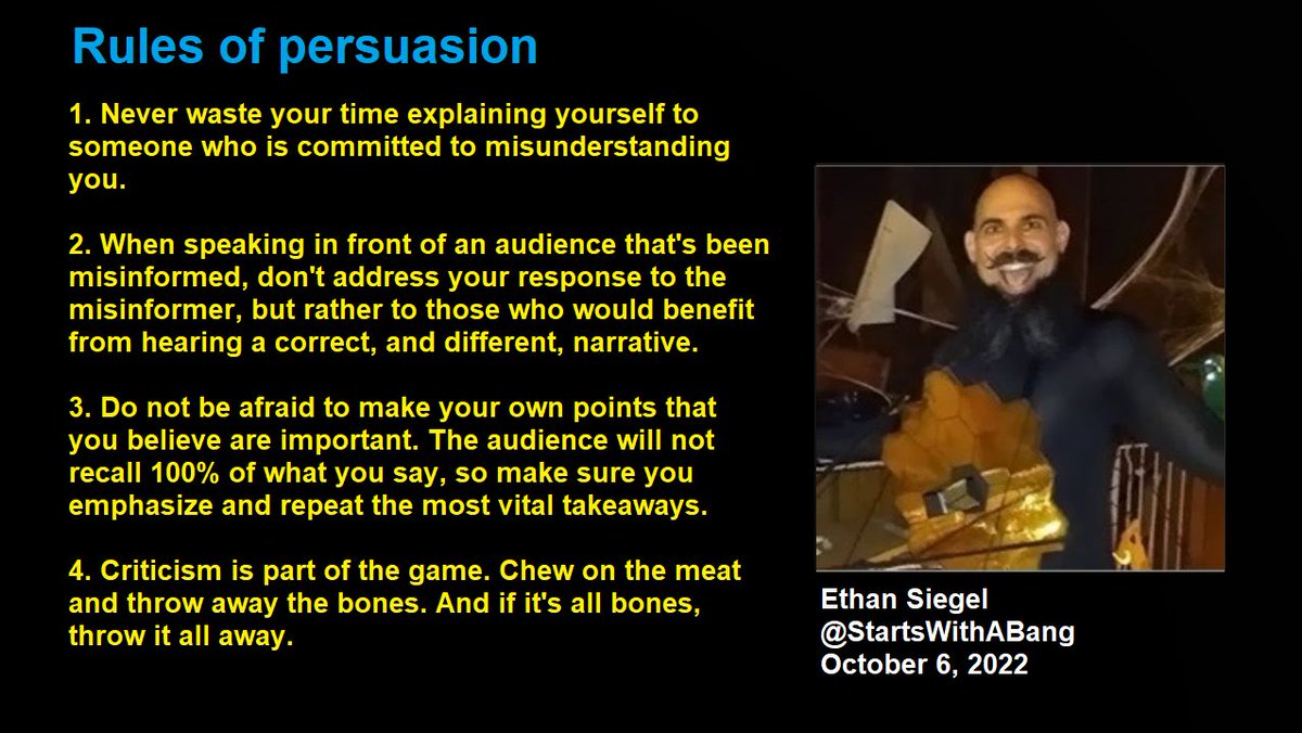 Anyone who’s ever tried to convince someone who holds a position that they simply cannot be reasoned out of is familiar with Brandolini’s Law: the effort involved in debunking misinformation is an order of magnitude greater than the effort involved in creating it. And yet, this is because the very act of debunking misinformation may well be the wrong strategy to take, as it not only gives unwarranted legitimacy to the illegitimate position itself, but falls for the trap of taking up the argument on an unequal, unfair playing field. If you want to argue for the scientific truth in a more persuasive manner, consider adopting these four rules of persuasion.