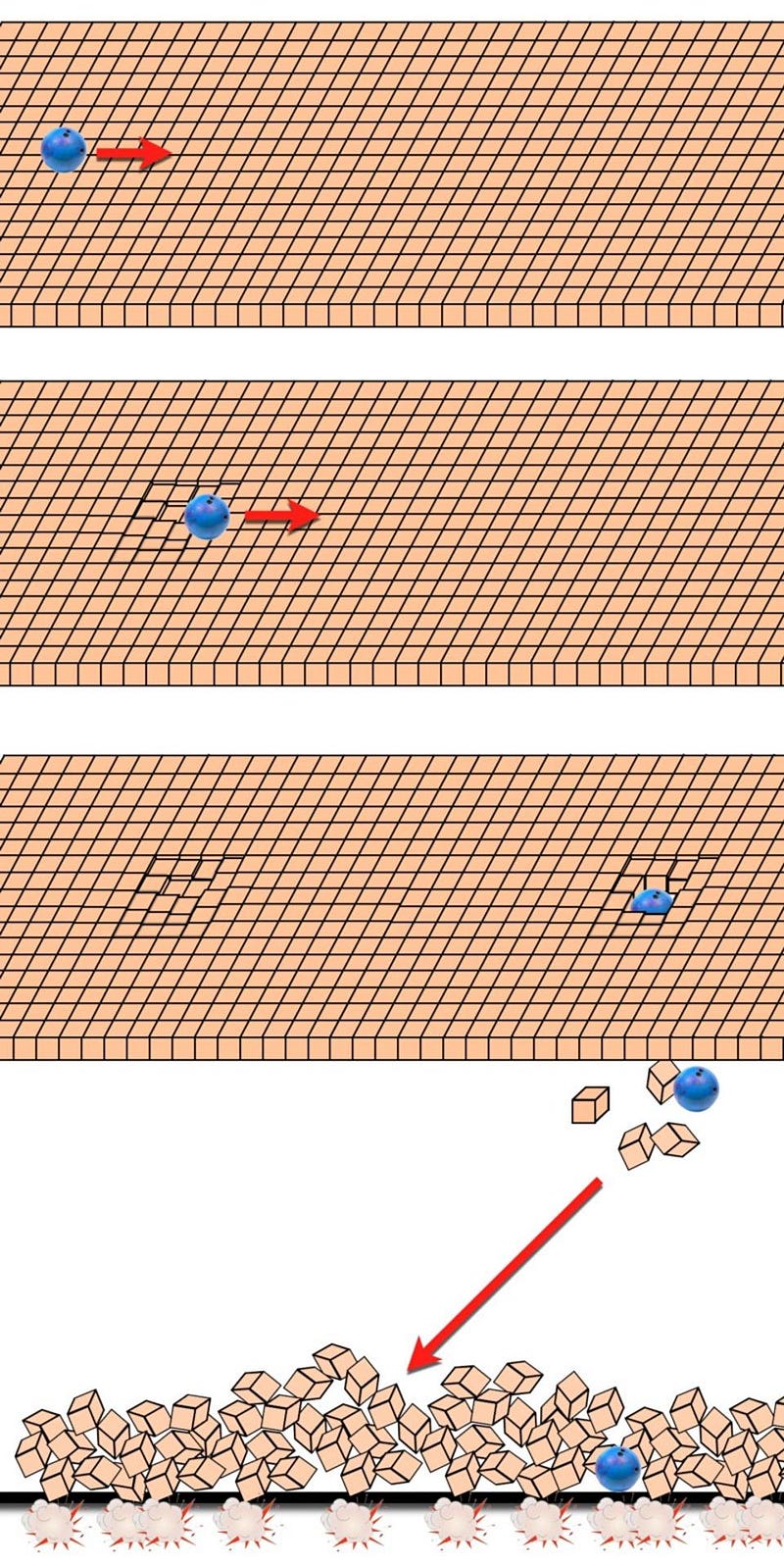 Here’s how you can visualize this. Imagine you’ve got a huge, infinite surface of cubic blocks pushed up against one another, held up by some incredible tension between them. At the same time, a heavy bowling ball rolls over them. In most locations, the ball won’t make much progress, but in some “weak spots” the ball will make an indentation as it rolls over them. And at one fateful location, the ball can actually break through one (or a few) of the blocks, sending them plummeting downwards. When it does this, what happens? With these blocks missing, there’s a chain reaction due to the lack of tension, and the whole structure crumbles.