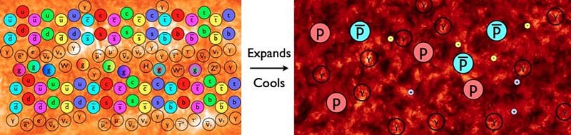For those of you wondering how we’ve got a Universe full of matter (and not antimatter) today, there must have been some process that created slightly more particles than antiparticles (to the tune of about 1-in-1,000,000,000) from an initially symmetric state, resulting in our observable Universe having about 1080 matter particles and 1089 photons left over.