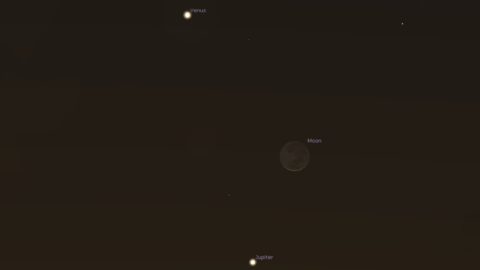 From the Americas, these objects will make a line: Jupiter closest to the horizon, followed by Venus and the Moon, and trailed by more-distant Saturn.