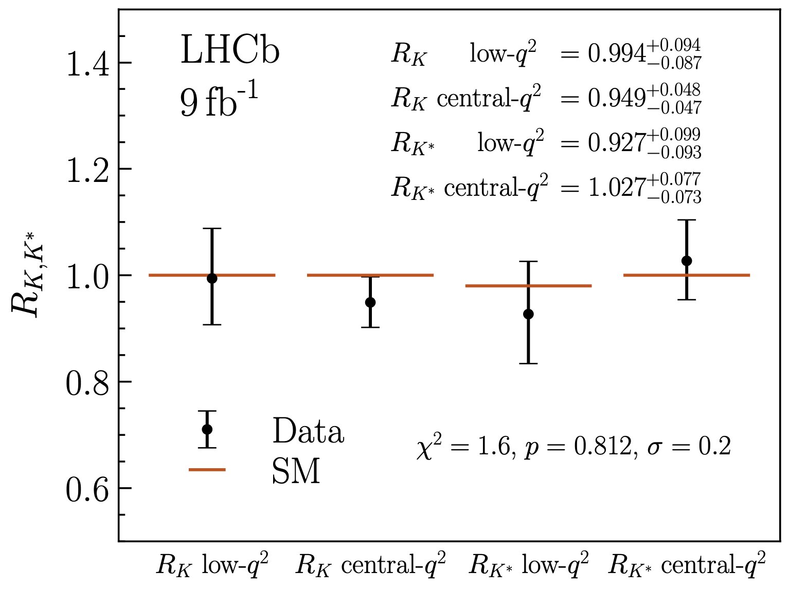Belle’s results were completely consistent with a 1:1 ratio, but Babar’s were a little bit low (just under 0.8), which got a lot of people excited about the Large Hadron Collider at CERN. You see, in addition to the two main detectors — ATLAS and CMS — there was also the LHCb detector, optimized and specialized to look for decaying particles that were created with a bottom quark inside. Three results were published as more and more data came in from LHCb testing lepton universality, with that ratio stubbornly remaining low relative to 1. Going into the latest results, the error bars kept shrinking with more statistics, but the average ratio hadn’t changed substantially. Many began to get excited as the significance increased; perhaps this would be the anomaly that at last “broke” the Standard Model for good!