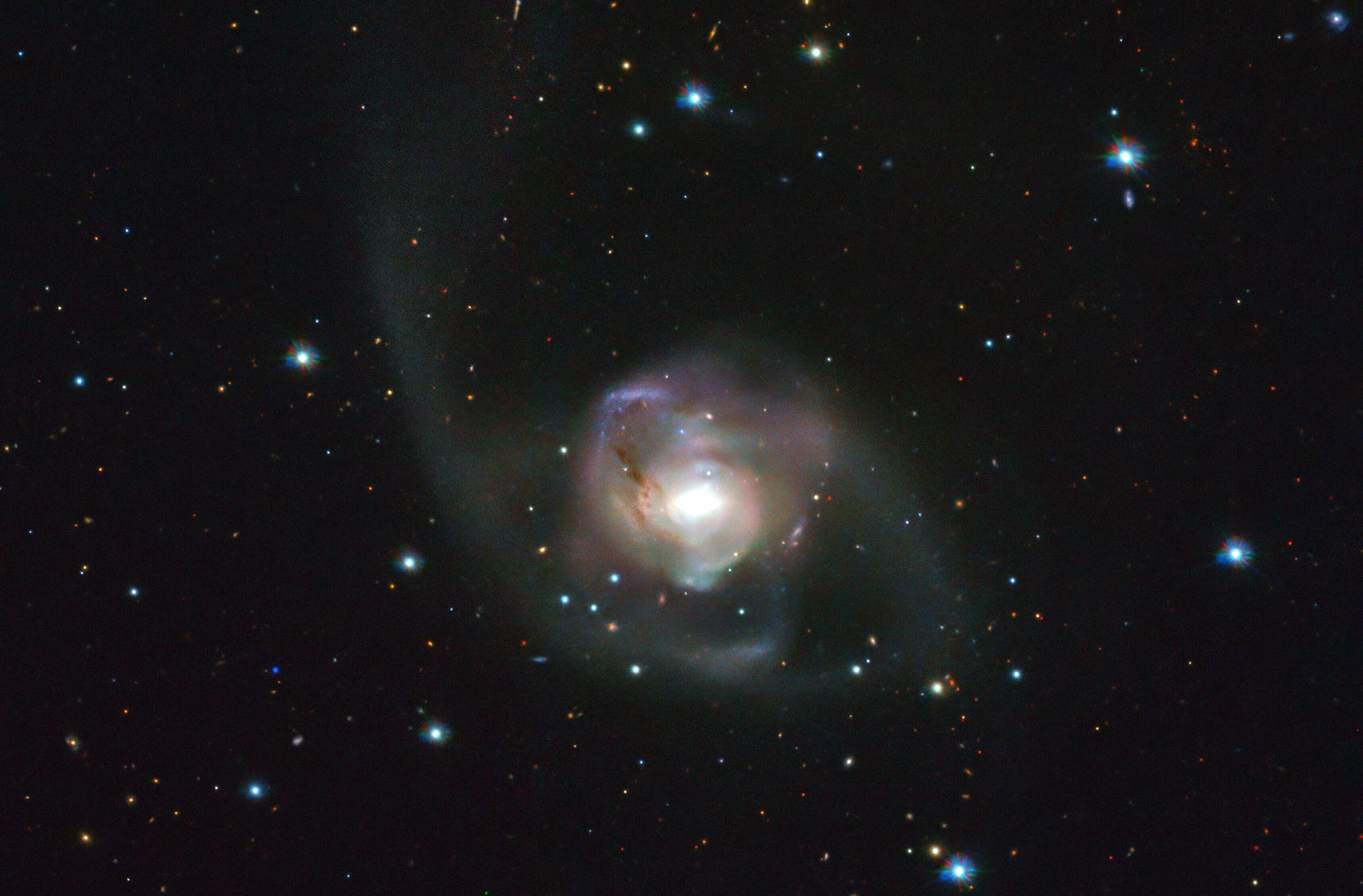 The galaxy NGC 7727 shows extended spiral arms: likely the aftermath of a recent major merger. The presence of two supermassive black holes inside this galaxy may be a prelude to the most major merger to occur in our local neighborhood in some time. (Credit: ESO/VST ATLAS team. Acknowledgment: Durham University/CASU/WFAU)