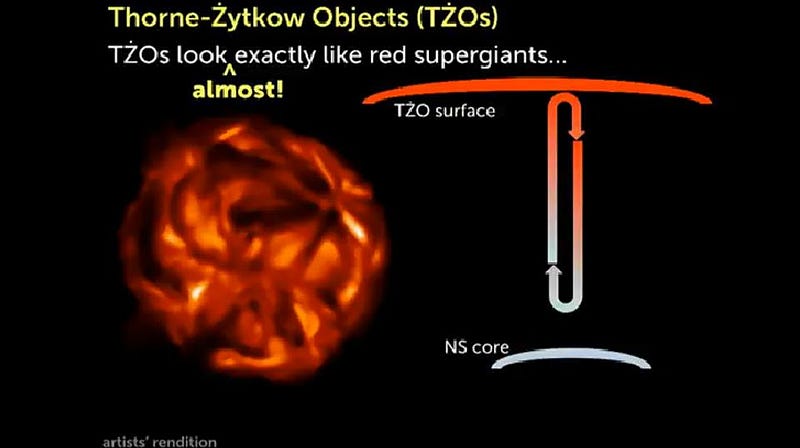 A Thorne-Zyktow object should be a red supergiant star that’s merged with a neutron star that sank to its core. Arguably, approximately 1-out-of-70 observed red supergiant stars showed the spectral signature you’d associate with a Thorne-Zytkow object. It’s an unusual fate for a supergiant star, but these exceptional cosmic beasts do exist. (SCREENSHOT FROM EMILY LEVESQUE’S PERIMETER INSTITUTE LECTURE)