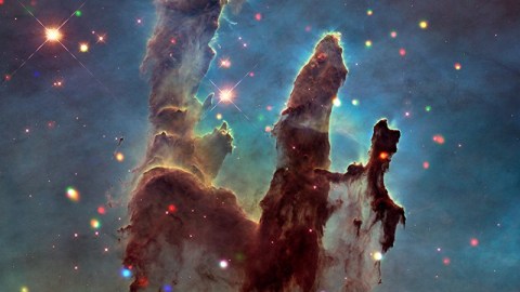 The infrared view of the pillars allows the newly forming stars, inside the pillars, to be seen. The blue signature showcases gas in the process of evaporating; the faintness of that signal indicates a relatively slow rate of evaporation. It should take at least 100,000+ years for the pillars to evaporate completely. (NASA, ESA/HUBBLE AND THE HUBBLE HERITAGE TEAM; ACKNOWLEDGEMENT: P. SCOWEN (ARIZONA STATE UNIVERSITY, USA) AND J. HESTER (FORMERLY OF ARIZONA STATE UNIVERSITY, USA))