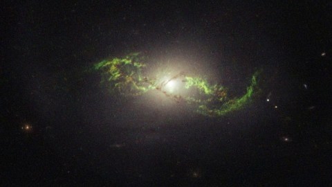 One of these Voorwerpjes clearly shows that the green illumination is coming from gas well outside the main galaxy, which itself shows evidence of new star formation and activity near its core. There are many regions rich in this green emission that do not have identifiable stars in them. (NASA, ESA, W. KEEL (UNIVERSITY OF ALABAMA), AND THE GALAXY ZOO TEAM)