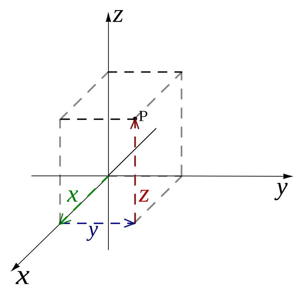 The displacement between any two points in three-dimensional space, such as the origin and point P shown here, is equal to the square root of the sum of the squares of the distance differences in each of the three (x, y, and z) directions. A mathematical expression describing that overall displacement, d, is given by the equation d = √(x² + y² + z²).