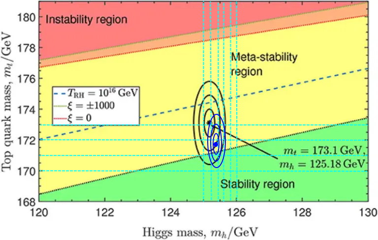 Right now, the two most important parameters in performing such a calculation are the mass of the top quark and the Higgs boson. The best value we have for the top mass is 171.77±0.38 GeV, and the best value we have for the Higgs mass is 125.38±0.14 GeV. This appears extremely close to the metastable/stable border, where the blue dot and the three blue circles below represent 1-sigma, 2-sigma, and 3-sigma departures from the mean value.