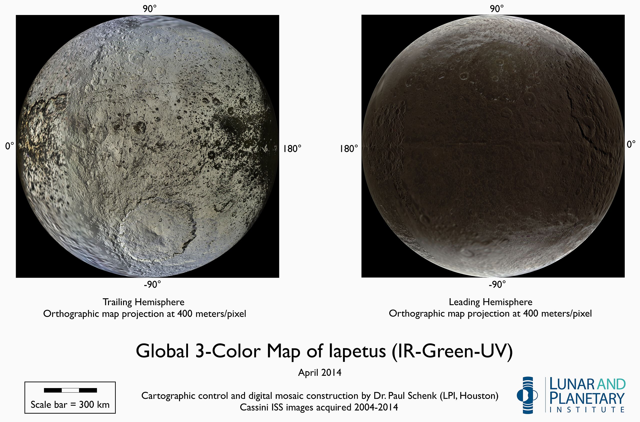 For Iapetus, there’s an outermore moon known as Phoebe that’s an incredible source of dust: Phoebe generates its own large, diffuse dust ring that was discovered in infrared light. As Iapetus moves ahead in its orbit, it plows into this dust ring: accumulating this darkened material on its leading hemisphere but not on its trailing hemisphere. Even though ices form on Iapetus continuously, the darker material heats up when it’s in direct sunlight, sublimating those ices and causing them to preferentially be deposited on the lighter-colored trailing side. As a result, Iapetus’s leading side is six times more reflective than its trailing side: the most severe difference known in all the Solar System.