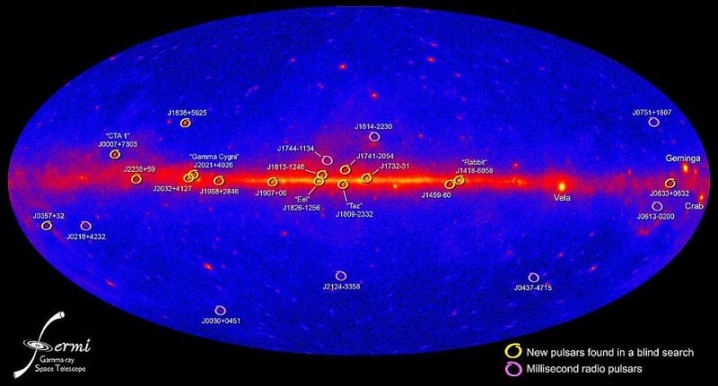1.) There are likely about one billion pulsars in the Milky Way. Based on the history of stars and star-formation in the Milky Way, we’ve been able to determine that even though only a fraction of 1% of them go supernova, there are incredible numbers of neutron stars and black holes out there. There are some 400 billion stars in the Milky Way today, and recent work has shown that there are approximately 100 million black holes in the Milky Way, with ten times as many (one billion) neutron stars. Almost all neutron stars have the properties to make them pulse, which just means their spin-axis and their magnetic-axis aren’t perfectly aligned. To know which 14 are chosen out of one billion will be a daunting task, since pulsar periods are not unique.