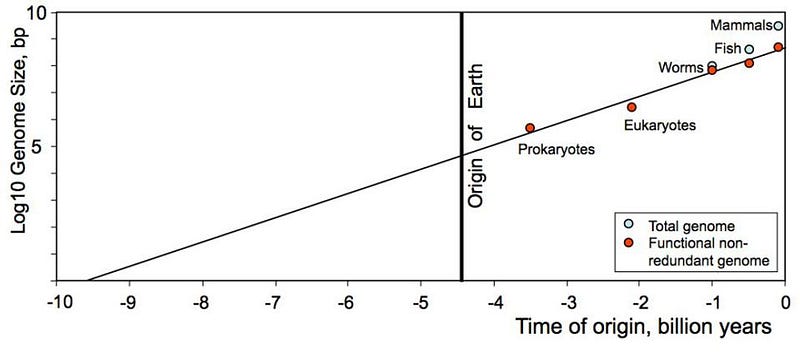 Reason #3: the complexity of life on Earth indicates, via extrapolation, a much earlier origin than Earth alone can provide. Here’s a fascinating and suggestive idea: take the most genetically complex organisms that exist today, and sequence their DNA. Take note of the length of their nucleic acid sequence, including the unique, non-overlapping genes, proteins, and other information that’s encoded in them. Then, going back through the fossil record, try and trace how that complexity has evolved. (I promise, this isn’t a creationist trick!)