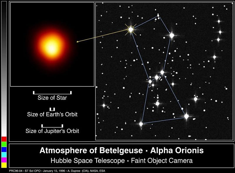 The black hole at the center of the Milky Way should be comparable in size to the physical extent of the red giant star Betelgeuse: larger than the extent of Jupiter’s orbit around the Sun. Image credit: A. Dupree (CfA), R. Gilliland (STScI), NASA.
