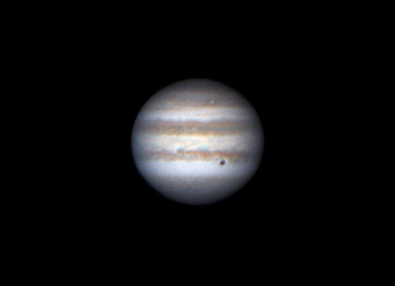 Jupiter, as photographed in 2004 from Earth, occasionally has a dark circle on it, as one of its moons casts a shadow on its atmosphere. Here, Ganymede, the largest moon in the solar system and a world even larger than Mercury (but smaller than Mars), has its shadow fall on its Jovian parent. (Jamie Cooper/SSPL/Getty Images)