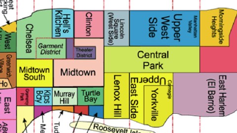 Any and every American city is built up out of Avenues and Streets, most of them numbered. A much nicer way to describe a city is by mapping its neighbourhoods. As in this map of Manhattan.
