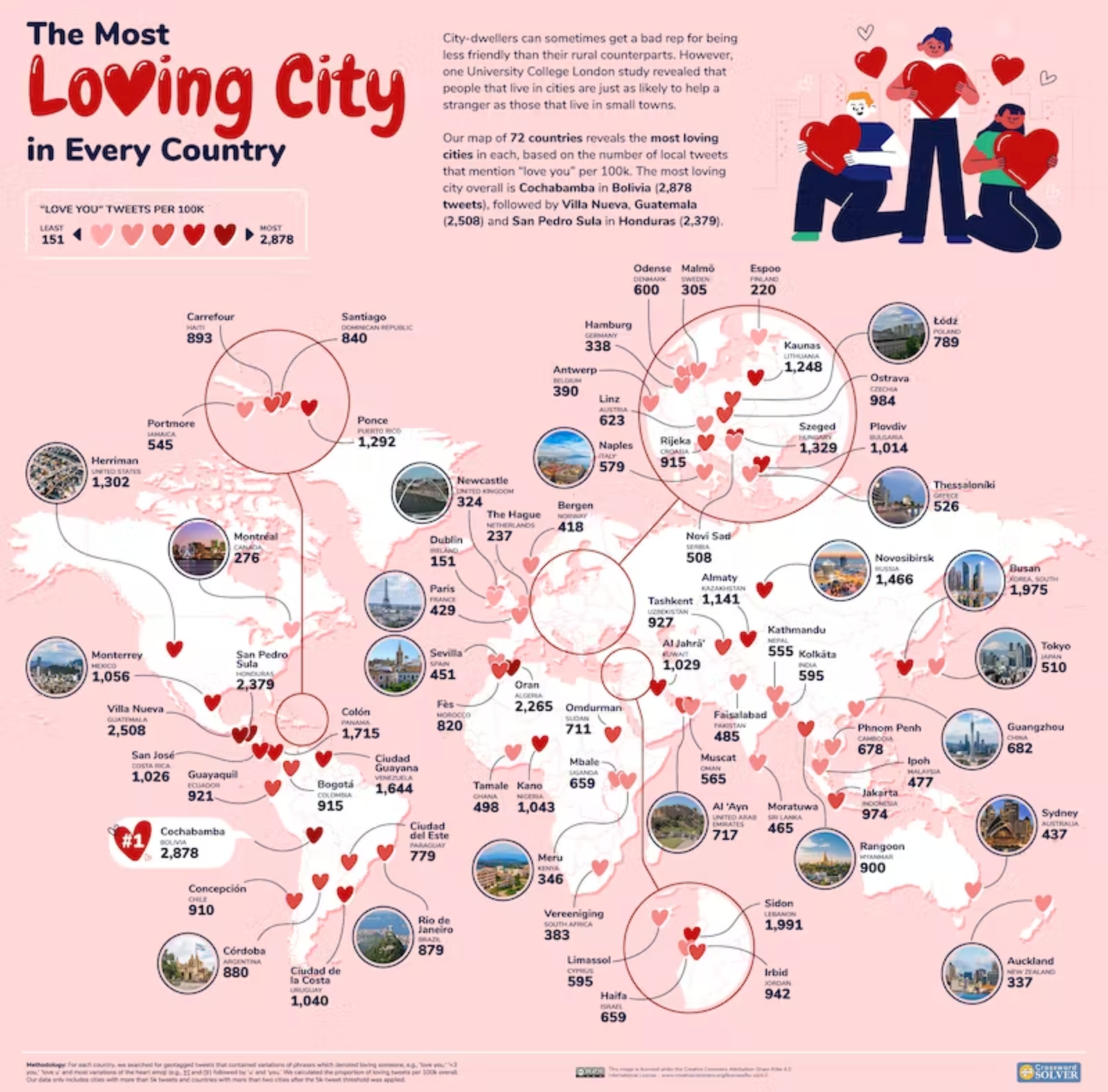 Based on 15 million tweets from 72 countries, a study by renowned psephologists Crossword Solver found that the most loving city in Canada was Montréal; in Mexico, it’s Monterrey. The surprising winner in the U.S. was Herriman, a recent boomtown of about 55,000 people in Utah. The most loving cities globally are all in Latin America: Cochabamba in Bolivia, followed by Villa Nueva, Guatemala and San Pedro Sula in Honduras.