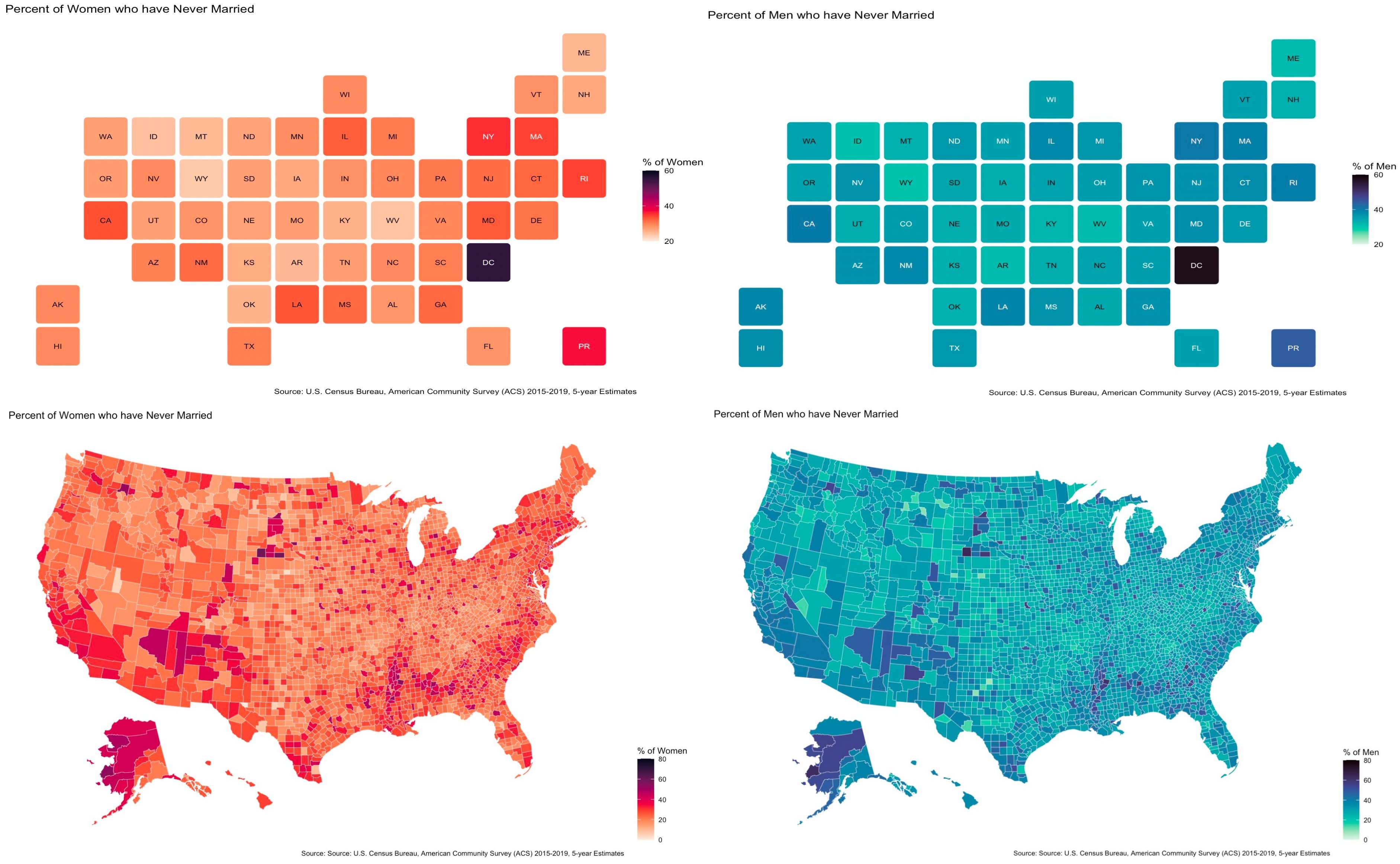 The day after Valentine’s Day is Singles Awareness Day. These maps from 2019, based on U.S. Census data, show the share of men and women in the U.S. who have never married (darker means more unmarried people). On the top are two cartograms, showing results per state; the two maps at the bottom better reflect the geographic spread.
