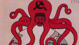 Those countries are shaded in a lighter tone of red in this map, thus underlining the image of Communism seeping into Europe from Russia, making the ‘uncontaminated’ parts of Europe look threatened.