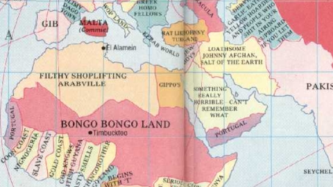 ‘Slanty-Eyed Chinky Takeaway Land’ could have been a name for China thought up by upper-class British anachronisms such as Prince Philip. Japan gets a positive mention as ‘The Wonderful Hardworking Japanese’. Straight above lies the Kamchatka peninsula, incorrectly labelled as ‘Used to Be British, But Gone to the Dogs Now’. Coloured in British pink are an oversized Hong Kong, and the Philippines (labelled ‘Channel Islands’ and ‘Au Pair Land’). Australia is ‘Singapore’, Tasmania is ‘Thingy’. Indonesia is ‘No Idea’, ‘Nope’, ‘Who Cares?’ and so forth. The former British Raj in the Indian subcontinent is labelled ‘Pakis’, while the Middle East rounds out Asia with another ‘Portugal’ (on the southern coast of Arabia, where Yemen and Oman are), and a few other descriptions too nasty and in any case too illegible to reproduce here.