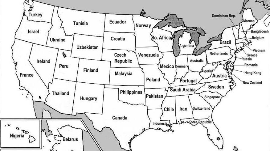 Update: Strange Maps is happy finally to be able to give credit where it is due. As was pointed out to us, this iconic map was conceived by Earl Fry, professor of political science at Brigham Young University, for the Globe and Mail in Toronto. Prof. Fry has since produced a number of updated versions of this map for the Canadian newspaper.