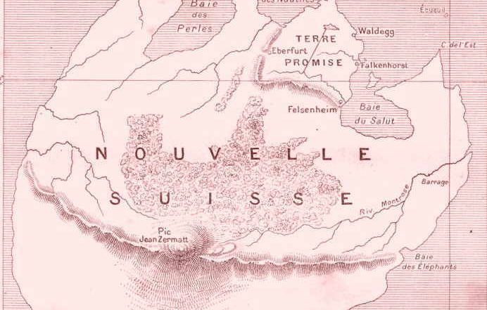 Further adventures ensue, with plenty of unfriendly natives, sea-travel and shipwrecks. In the end, the island is annexed by Great Britain and the flourishing colony soon has over 2,000 inhabitants. This map (in French, but with some place names in German and English) shows the shape, names some features and indicates the settlements on Nouvelle Suisse.