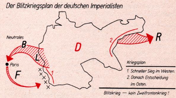 In 1905, count Alfred von Schlieffen, Chief of Staff of the German Army, developed a plan to win the impending war with France and Russia. In the time it would take Russia to mobilise, a swift campaign on the Western front would defeat France, allowing the troops to then be shipped to the Eastern front. Thus, a Blitzkrieg (‘lightning war’) in the West would prevent a ‘Zweifrontenkrieg’ (a war on two fronts) and ensure a German victory.