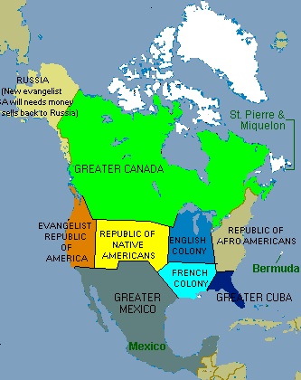 The three countries most affected by American foreign policy get a big slice of the US, Iraq occupying the West Coast, Afghanistan the eastern part up to the Mississippi, Palestine most of what’s in between. A purple sliver between Iraq and Palestine is reserved for something I can’t translate. Bizarrely, two UN institutions get Louisiana (WHO) and Wisconsin and some of Michigan (Unicef).