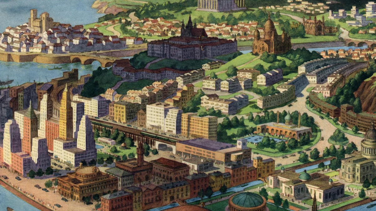 Mid-20th century British illustrator Ronald Lampitt had a predilection for maps. It probably was no coincidence that he got to draw, in the Illustrated Magazine of 17 February 1951, the proposal of John Sleigh Pudney for an ideal city.