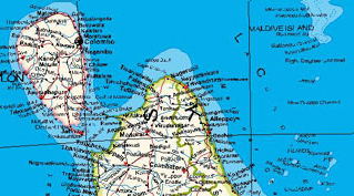The island-nation of Sri Lanka (formerly known as Ceylon) dominates the top of the map– and suddenly seems more like the jewel in the crown of the subcontinent, less like an appendage of its larger neighbour India.