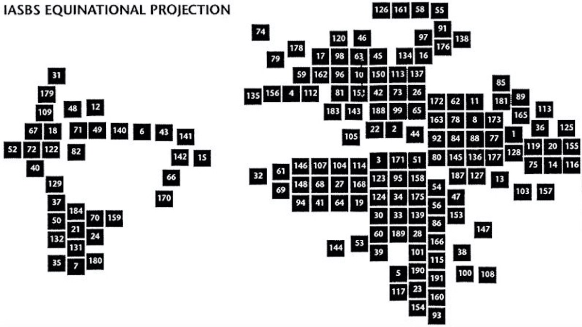 “The equinational projection was invented by my friend Catherine Reeves for Globehead! in 1994,” writes Jeremy W. Crampton, professor of Geography at the University of Kentucky, who sent this map in. He kindly explains the cryptic acronym IASBS: International Association for the Study of Big Science.
