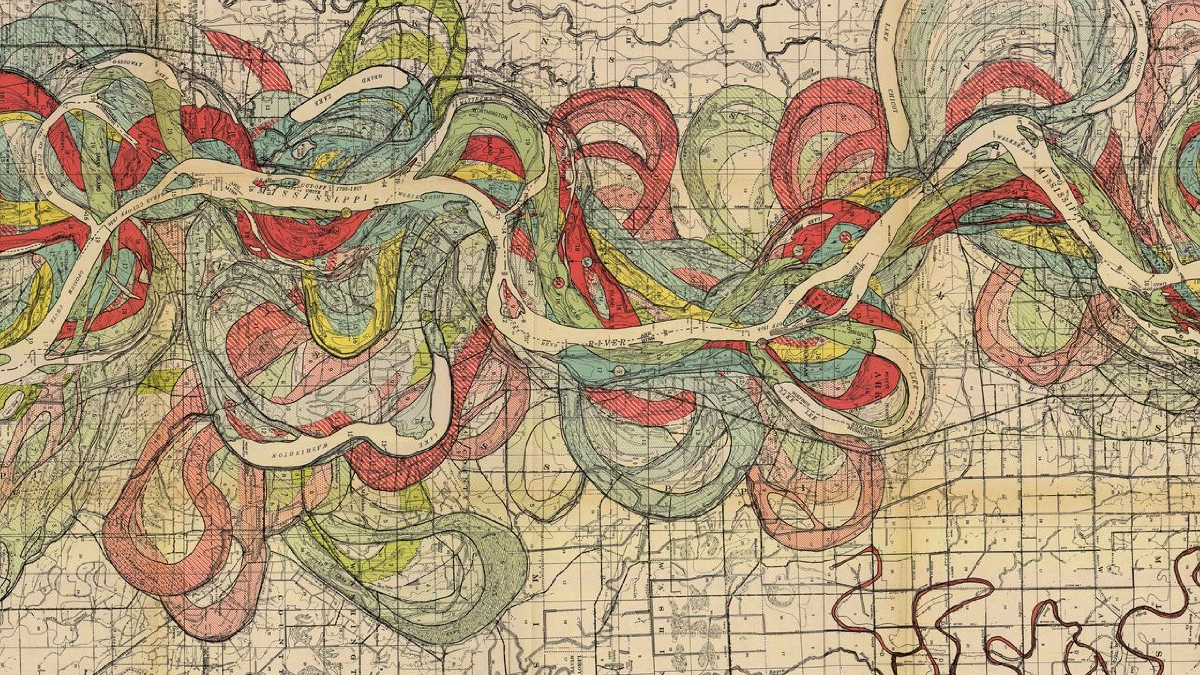 “Looks like a spaghetti dinner brought to you by Crayola,”says Joseph Kinyon of the map he sent in. It’s one of many by Harold N. Fisk, an important figure in charting alluvial maps of the Lower Mississippi Valley.