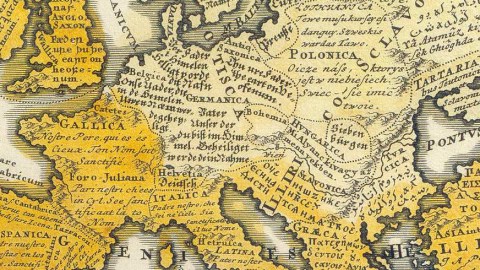 The map itself attempts to show the concordances and differences between all the ancient languages spoken in Europe by spelling out the first words of the Lord’s Prayer in each of them, in King-James English: “our father who art in heaven (hallowed be thy name)”.