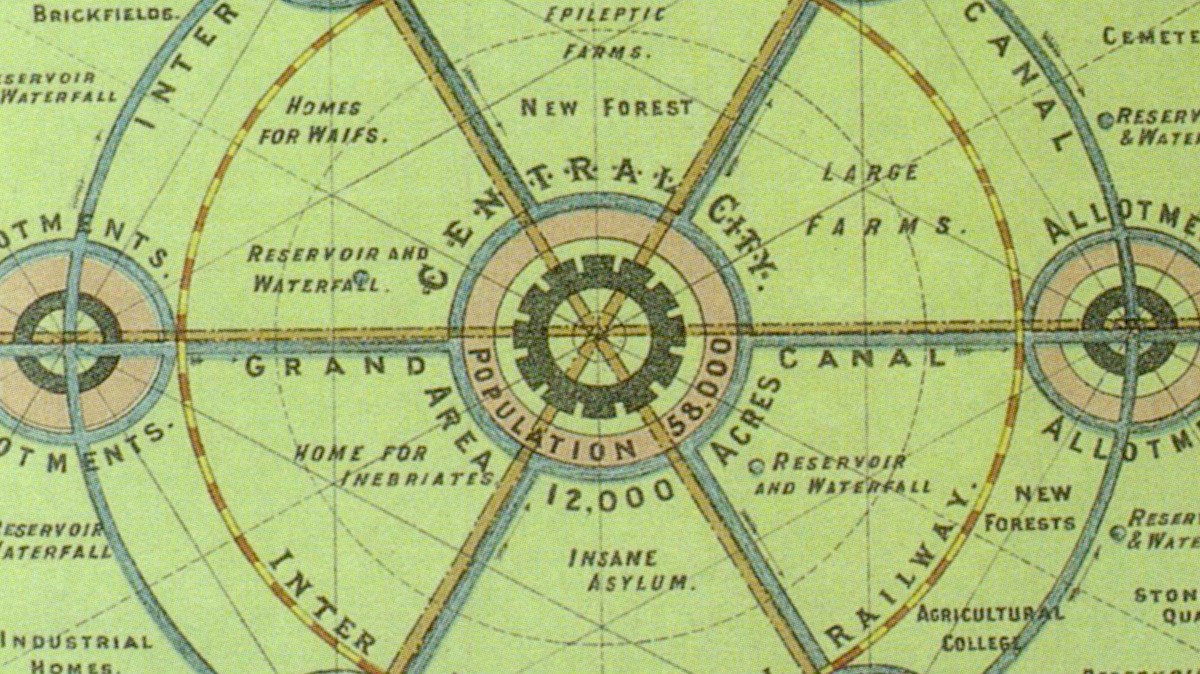 The map was drawn up by Sir Ebenezer Howard (1850-1928), the father of the garden city movement. Howard believed the living conditions of the poor, huddled masses cramped together in giant, insalubrious cities could be improved by combining the best aspects of town and country and carefully allocating space to housing, industry and agriculture.