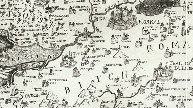 His Map of An Englishman (2004) is a mock-Tudor etch of an imaginary island, not coincidentally resembling a brain, surrounded by Psychopath, Bipolar Disorder, Schizophrenia, Delirium and other unpleasantness at sea; divided into counties with alluring names such as Tender, Bitch, Romance, Cliché and Guru – Normal and Easy are pretty small areas, and Fear is a large, scary forest in the east.