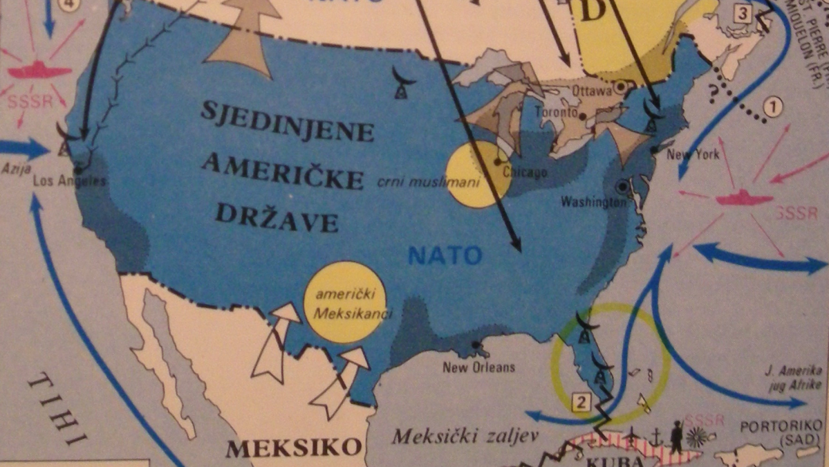 “While on vacation in Dubrovnik, Croatia this summer, we ran across an old Yugoslav atlas which included this map on the entry for the US. My Serbo-Croatian isn’t so good so I don’t know the true details as to what it’s about, but it appears to be plans for a Russian invasion,” says Andrew, who sent in this map.