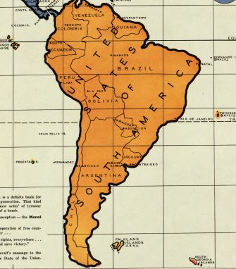 Mr Gomberg possibly took his cue for this map from US president Franklin D. Roosevelt, whose speech about Four Freedoms and a Moral Order (from his State of the Union to the 77-th Congress) he quotes, before outlining his own vision (at the bottom of the map):