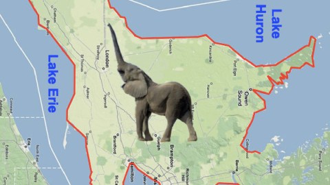 Elephants are native to Africa and India and… Canada? Well, not really, but if you tilt your average north-oriented map of Ontario 90 degrees to the right, the province’s southern peninsula will show a more than passing resemblance to an elephant, tooting its trunk.
