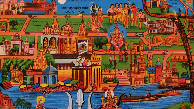 This map details some of the sacred places of Varanasi, including some of the ghats (i.e. the steps that lead down to the Ganges river) that are used in rituals, including cremations. More information on the temples and other items marked on this map would be welcome. Any Varanasians in the room?