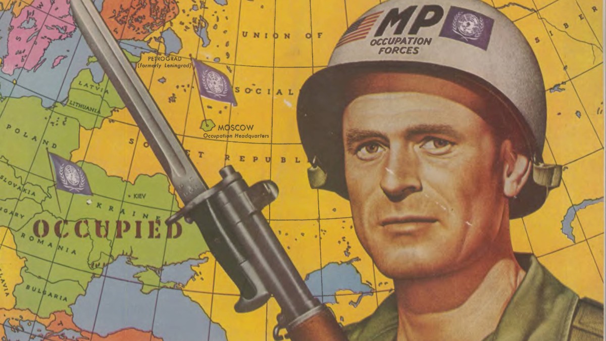 The map behind the soldier shows the UN flag flying over Moscow, with the Eastern Bloc countries, the Baltic Soviet republics and Ukraine (but not Belarus) marked as ‘occupied’. Does this leave the rest of the Soviet Union as ‘unoccupied’, or ‘less occupied’, while Moscow nevertheless is under US/UN control?